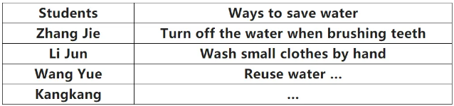 We all take an active part in this activity. Zhang Jie's family usually turn off the water when brushing teeth. In order to save water, Li Jun always washes small clothes by hand. Wang Yue thinks reusing water works well. After washing vegetables, she uses the water to clean the floor. In my family, we take a shower instead of a bath.