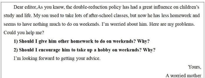 假如你是某英语报的编辑Linda,收到一位中国母亲的来信,信中她向你反映了“双减”政策 (double reduction policy) 实行后她所遇到的困惑。请根据信的内容,给她写一封回信,帮她解决困惑。