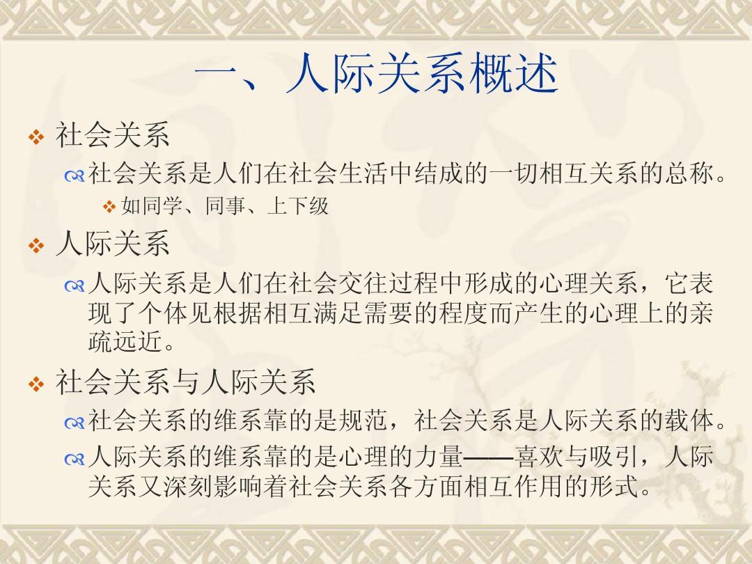 人际关系(Interpersonal relationships)是指人与人之间,在一段过程中,彼此借由思想、感情、行为所表现的吸引、排拒、合作、竞争、领导、服从等互动之关系,广义地说亦包含文化制度模式与社会关系。