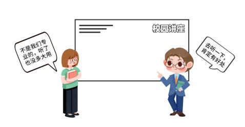 图画中,两个女生正站在一张校园讲座的海报前。其中一个女生说:“不是我们专业的,听了也没多大用。”而另一个女生则回应:“听听总会有好处。”