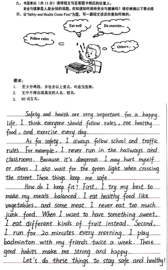 我想保持身体健康,所以养成了良好的饮食和生活习惯。在饮食方面,我总是按时吃三餐。新鲜的蔬菜和水果是我的最爱,我从不吃太多糖果、薯片这类垃圾食品。我每天还会喝足量的水。在生活方面,我早睡早起,从不熬夜看电视或玩游戏。放学后,我经常和朋友们一起做运动,比如跑步和跳绳。这些好习惯让我每天都感觉健康又有活力。